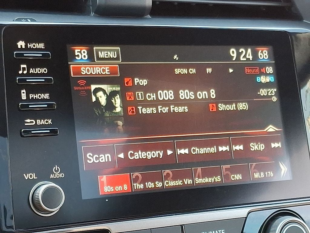 - Radio: 450-Watt Premium Audio System w/10 Speakers -inc: subwoofer, 7-inch display audio w/high-resolution electrostatic touch-screen, knob and hard keys for primary controls and customizable feature settings, HondaLink, Apple CarPlay integration, Android Auto integration, SiriusXM, HD Radio, Bluetooth® HandsFreeLink, Bluetooth® streaming audio, SMS text message function, Radio Data System (RDS), Speed-Sensitive Volume Compensation (SVC), 1.0-amp USB audio interface port in center console, 1.5-amp USB smartphone/audio interface port in front console, illuminated steering wheel-mounted controls and fin-type roof-mounted antenna