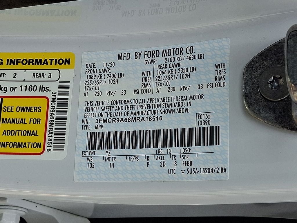Equipment Group 100A: 17" Sparkle Silver Wheels; 3.80 Axle Ratio; Cloth Front Bucket Seats; 1.5L EcoBoost Engine; 8-Speed Automatic Transmission; 225/65R17 102H All Season BSW Tires; 4. 630 lbs GVWR; AM/FM Stereo. Front and Rear Floor Liners. **Equipment listed is based on original vehicle build and subject to change. Please confirm the accuracy of the included equipment by calling the dealer prior to purchase.**